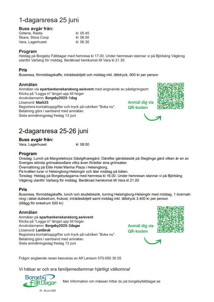 Välkommen att följa med i bussen som går till Borgeby Fältdagar den 25-26 juni. Vi kan erbjuda en 1-dagarsresa eller en 2-dagars resa med övernattning.